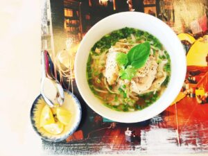 ホーチミン出身のフックさんは、日本語学校を経てAPU(立命館アジア太平洋大学)へ。在学中に「クーポノス」を開き、以来、化学調味料に頼らず出汁からつくる素直な味でファンを増やしてきた。店名「クーポノス」は惑星の名から着想した造語。「初めは大きな相席テーブルでしたが、コロナ禍で席配置を見直し、今の形に。地域の”日常”にベトナムの素朴なおいしさを連れてくる場所にしたい」と話す。
