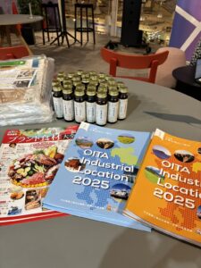実証実験に関心を持つ起業家の方々と直接意見交換ができ、首都圏での大分への関心の高さを肌で感じることができました。また、ブースではアトツギ向け伴走支援プログラムなどに関わりのある、株式会社後藤製菓様にご協力いただいた「生姜百景-GINGER SHOT-」などを配布し、大分の魅力も味わっていただきました。